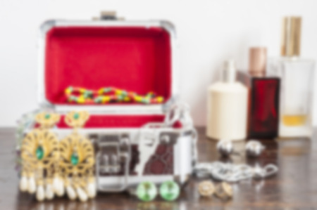 Blurred costume jewelry. Earrings, necklaces, bracelets. Accessories for women. Blur backgrounds concept.