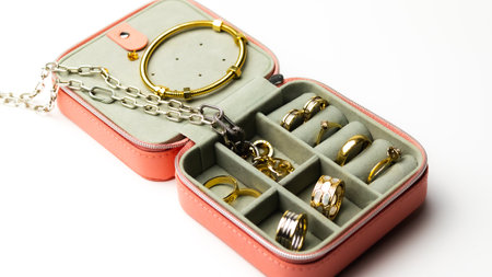 Jewelry storage case with open compartments for rings and necklaces, laid on white