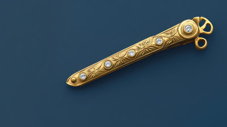 This close-up image showcases an ornate sword with a beautifully designed handle, set against rich blue fabric. Perfect for themes of craftsmanship and history.