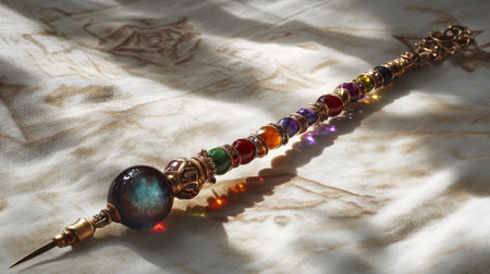 A mesmerizing magical wand adorned with vibrant gemstones rests elegantly on a textured fabric. The sunlight casts colorful reflections, adding a whimsical charm.