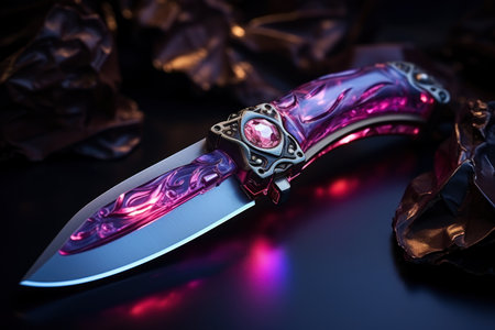 Beautiful exclusive expensive folding pocket knife decorated with precious stones, mystical glowing ritual dagger