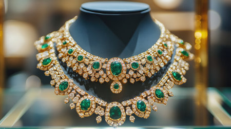 This exquisite jewelry piece features a stunning necklace set with emerald and diamond stones, showcasing intricate craftsmanship and a luxurious design.