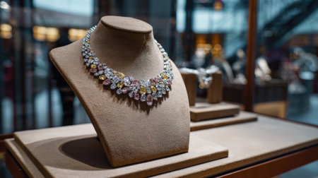 A stunning gemstone necklace elegantly displayed in a luxurious jewelry store, showcasing vibrant colors and intricate craftsmanship. Perfect for fashion lovers.