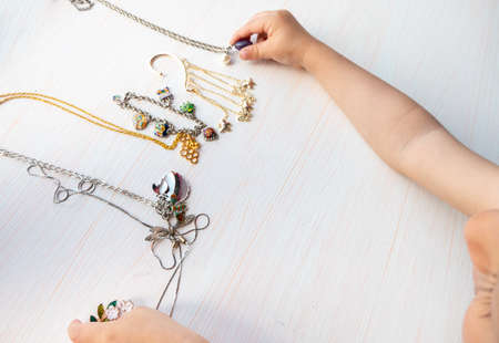 womens happiness - hands of child play with light summer bijouterie, on white background. High quality photo