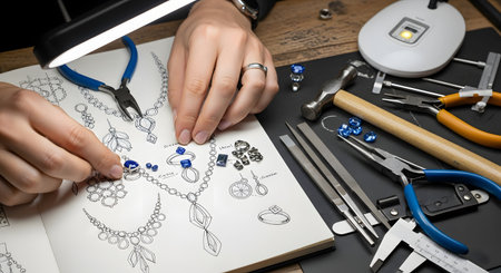 Close-up of a jeweler's hands placing blue gemstones onto a design sketch using tweezers. The workspace is filled with jewelry making tools creating a scene of precision and artistic craftsmanship.