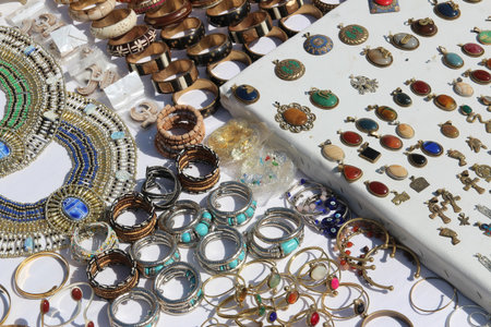Traditional Egyptian accessories display on the white cloth for sales in Aswan, Egypt