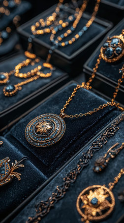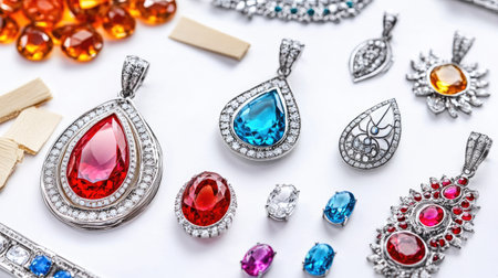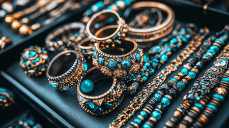 beautiful jewelry made of precious stones on a shelf in a store