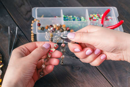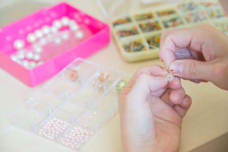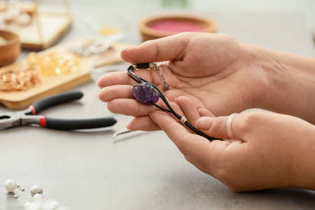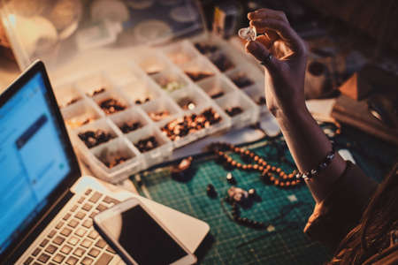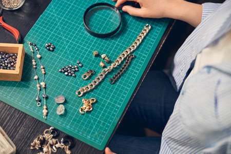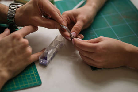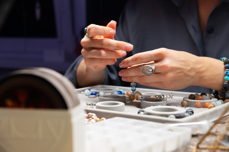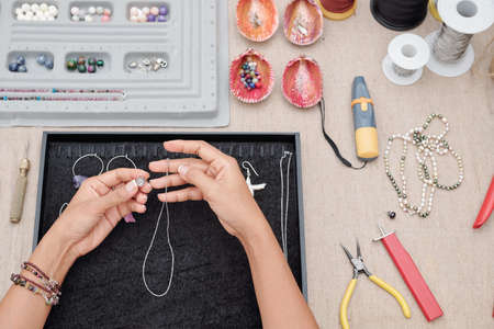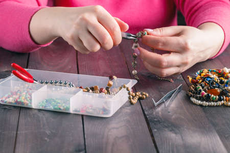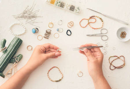 Hands of a young Caucasian woman collecting jewelry bracelets made at home. Individual jewelry made of stones and precious metals. Raw materials for making jewelry. Collection of precious stones.