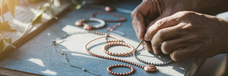 Artisan crafting handmade jewelry with beads and tools on a wooden table.