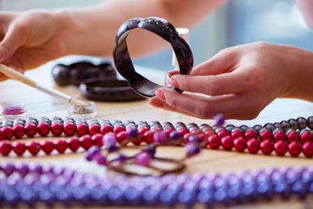 Lifestyle concept, work from home to reinvent your life - Jewelry designer workplace. Woman make jewelry. Georgian minankari enamel manufacturing technique. Jeweler making accessories in workshop.