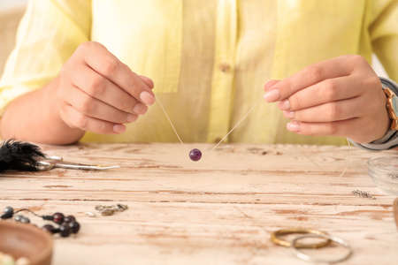 Lifestyle concept, work from home to reinvent your life: close-up of woman hands making macrame knotted jewelry with stone beads and tools on light wooden table