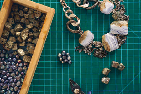 Jewelry making and beading process. Findings, pendants, geode and pliers. Making handmade jewelry. Accessories for needlework. Handmade accessories. Top view. Selective focus.
