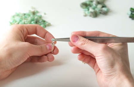Hands of a young Caucasian woman collecting jewelry bracelets made at home. Individual jewelry made of stones and precious metals. Raw materials for making jewelry. Collection of precious stones.