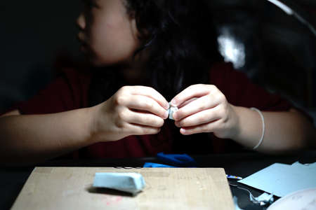 Hands of young craftswoman holding black plastic thread and glass bead