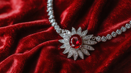 This captivating image features a luxurious ruby and diamond necklace resting elegantly on soft red velvet, highlighting the intricate craftsmanship and beauty of fine jewelry.