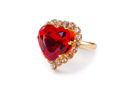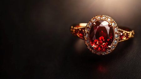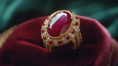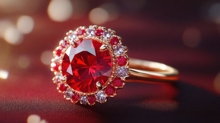 This stunning image features an exquisite golden ring showcasing a vibrant red gemstone surrounded by sparkling diamonds, perfect for highlighting luxury and elegance.