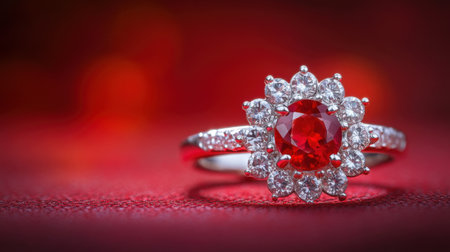 This stunning image features an elegant red gemstone ring surrounded by sparkling diamonds, resting on a smooth red fabric surface, perfect for jewelry showcases.