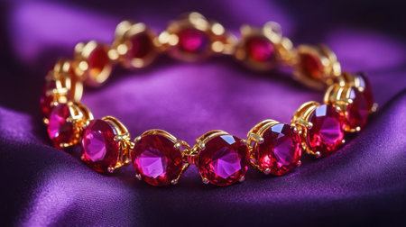 This stunning gold bracelet features vibrant ruby stones, set against a rich purple fabric backdrop. An exquisite piece to enhance any fashion ensemble.