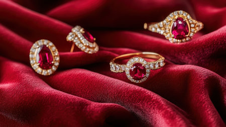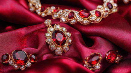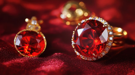 This exquisite image features captivating red gemstone jewelry, showcasing a ring and earrings, set against a lush red fabric background.