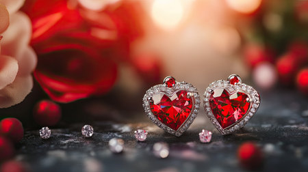 Stunning heart-shaped red earrings adorned with sparkling diamonds, featured against a romantic floral backdrop, perfect for special occasions and gifts.