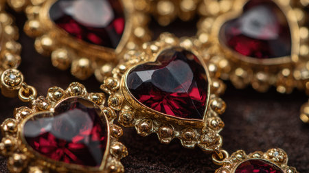 Close-up of exquisite heart-shaped red gemstones set in ornate gold jewelry, showcasing sophistication and elegance against a dark background.