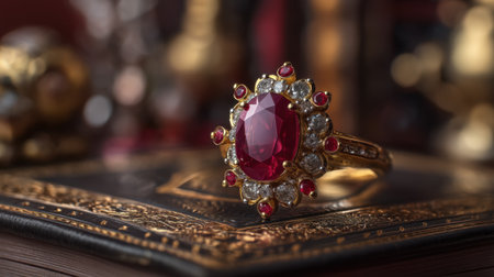 A stunning vintage ring featuring a prominent red gemstone, surrounded by intricate details and set against a luminous bokeh background. Perfect for capturing the essence of elegance and romance.