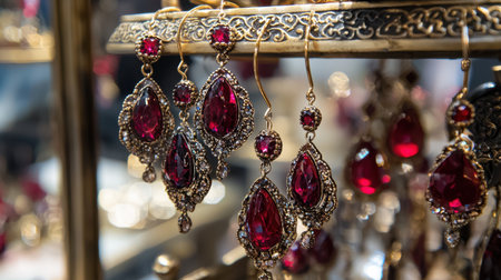 Discover a stunning display of elegant red gemstone earrings, featuring intricate gold detailing. Perfect for fashion enthusiasts and jewel lovers alike.