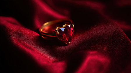A stunning heart-shaped ruby ring gracefully rests on rich red fabric, illuminated by soft light, embodying elegance and romance. Perfect for jewelry lovers.