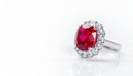 This stunning ruby ring, featuring intricate diamond accents, exemplifies luxury and elegance, perfect for jewelry photography or fashion displays.