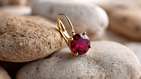 A stunning gold ring featuring a vibrant red gemstone, elegantly placed on smooth pebbles to emphasize luxury and natural beauty in design.