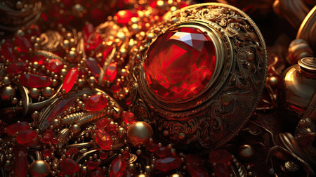 This stunning image captures an elegant ruby ring at the center of luxurious jewelry pieces, showcasing intricate designs and vibrant colors.
