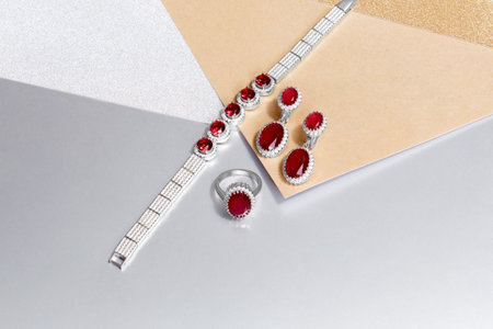 A stunning display of elegant jewelry featuring diamonds and rubies, perfect for highlighting luxury and sophistication in fashion photography.