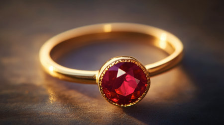 A beautifully faceted ruby gemstone resting in an elegant gold ring, shimmering under soft lighting.