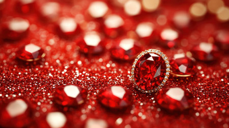 Shimmering red gems rest on a glittery surface, capturing light and evoking elegance and wealth.