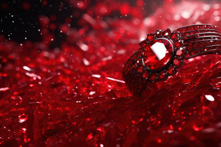 Beautiful abstract jewelery background with shiny red ruby gemstone. Horizontal background with copy space. AI generative image.