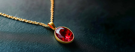 Elegant gold necklace featuring a vibrant red gemstone resting on a smooth dark surface contrasting with its brilliant shine