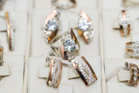 beautiful expensive jewelry, rings, amulets, necklaces, earrings in the store of elite jewelry