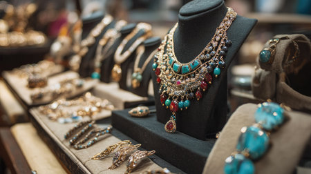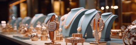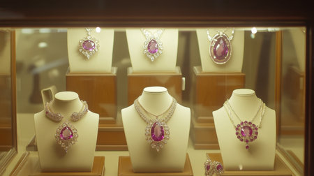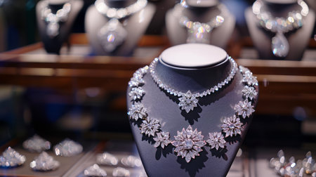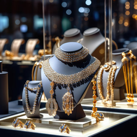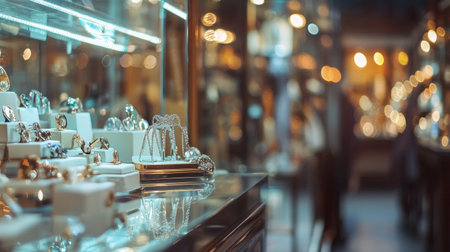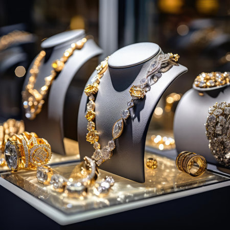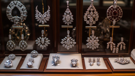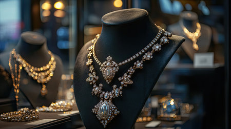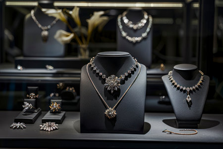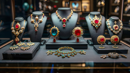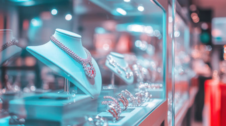 This stunning image showcases an elegant display of exquisite jewelry pieces in a boutique. The intricate designs and sparkling gemstones create an alluring atmosphere, perfect for jewelry enthusiasts.