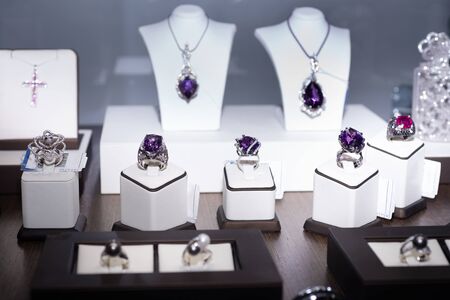 jewelry retail store showcase displaying white gold rings with amethysts and diamonds