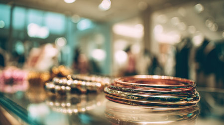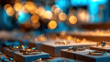 Jewelry pieces are elegantly arranged on a matte table with shimmering bokeh lights in the background, highlighting a stylish boutique atmosphere.