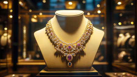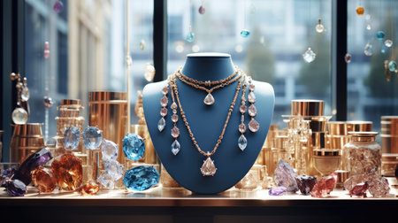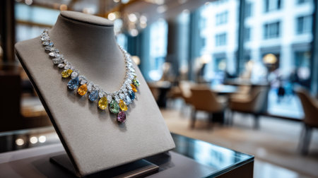 A stunning jewelry display featuring a luxurious necklace adorned with colorful gemstones, set within an elegant boutique interior, epitomizing sophistication and beauty.