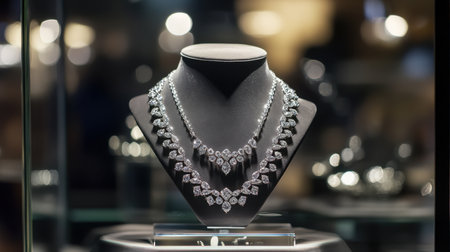 This stunning diamond necklace is elegantly showcased in a luxurious jewelry store, highlighting its beauty and craftsmanship. The exquisite design captivates the eye in a refined setting.