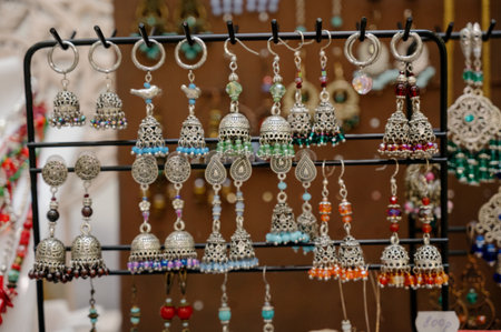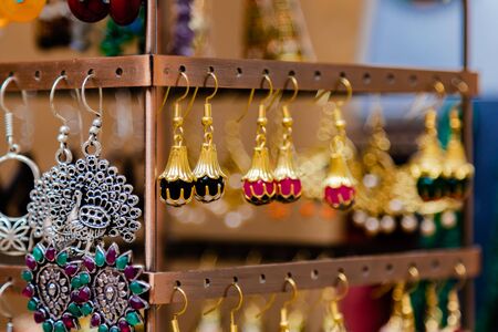 Close up of beautful jewellery hanging with hooks on the rack and a peacock shaped silver ear ring on the left