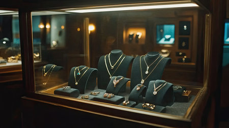 This image features an elegant display of exquisite jewelry in a glass showcase, highlighting a variety of necklaces and pendants, creating a luxurious atmosphere.