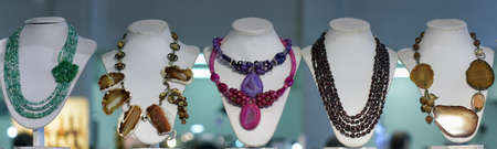 A stunning assortment of unique gemstone necklaces is showcased elegantly on satin busts inside a dimly lit jewelry boutique.