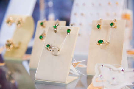 A set of luxury jewelry for sale in the store. showcase behind the glass