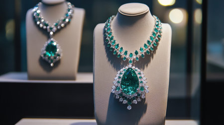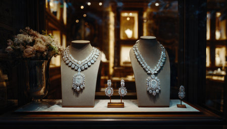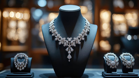 Two diamond necklaces and earrings are displayed on mannequins within a luxurious setting. The composition showcases intricate details with a soft focus, and the lighting highlights the gems' brilliance. The scene suggests high-end retail and offers possibilities for fashion, advertising, and editorial content.