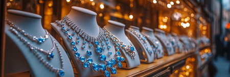 Elegant necklaces adorned with sparkling sapphires and diamonds attract attention in upscale jewelry store.