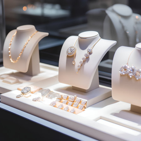 This striking image captures an elegant display of exquisite jewelry pieces in a modern boutique, showcasing intricate designs and radiant gemstones.