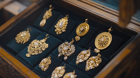 A stunning display of elegant jewelry pieces in an antique box, featuring a variety of exquisite designs with intricate details and sparkling gems.
